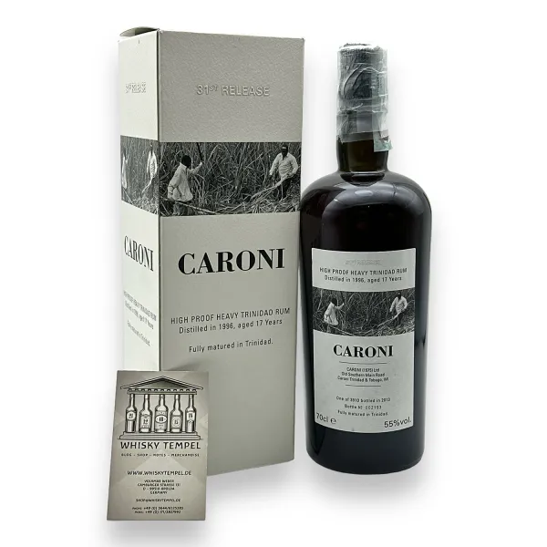 Seltener Caroni, nach Neubewertung und Revision durch Velier wurde die urspünglich und fälschlich auf dem Etikett vermerkte Auflage von 3910 Flaschen auf 1808 reduziert.