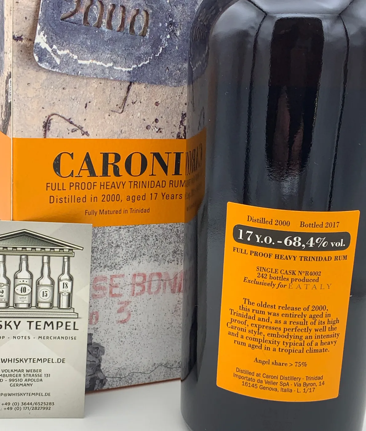 SOLD OUTDiese 17-jährige Caroni Single Cask-Abfüllung aus dem Jahr 2018 ist eine herausragene Abfüllung der Closed Distillery Caroni aus Trinidad/Tobago. 2000 destilliert, 100% tropical aged in Trinidad, abgefüllt 2018 in Full Proof von 68,4%. Ein Original-Bottling von Velier/Italien exclusiv für Eataly/Italien. Von Single Cask #R4002 wurden 242 einzelnummerierte Flaschen abgefüllt. Der Angels Share dieser Ausnahmeabfüllung betrug rund 75%.