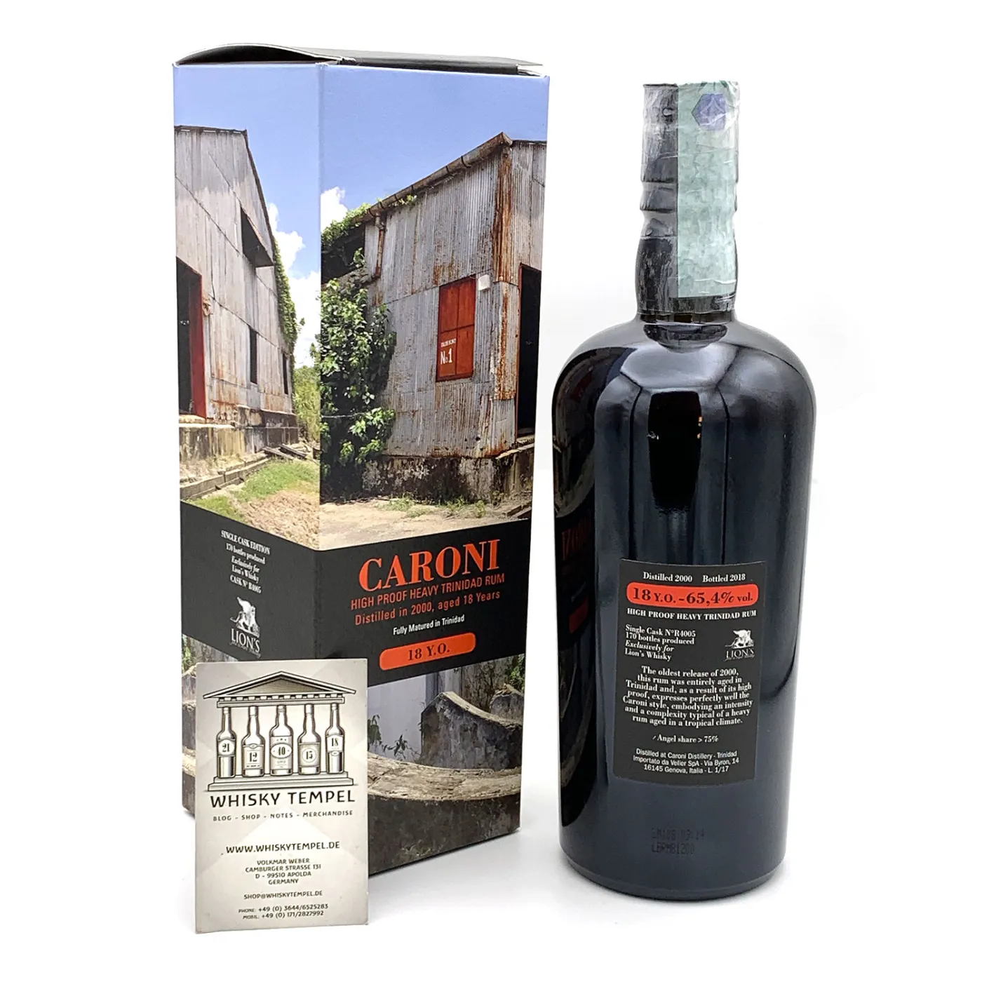 Diese 18-jährige Caroni Single Cask-Abfüllung aus dem Jahr 2018 ist eine herausragene Abfüllung der Closed Distillery Caroni aus Trinidad/Tobago. 2000 destilliert, 100% tropical aged in Trinidad, abgefüllt 2018 in Full Proof von 65,4%. Ein Original-Bottling von Velier/Italien exclusiv für Lions Whisky/Italien. Von Single Cask #R4005 wurden 170 einzelnummerierte Flaschen abgefüllt. Der Angels Share dieser Ausnahmeabfüllung betrug rund 75%.