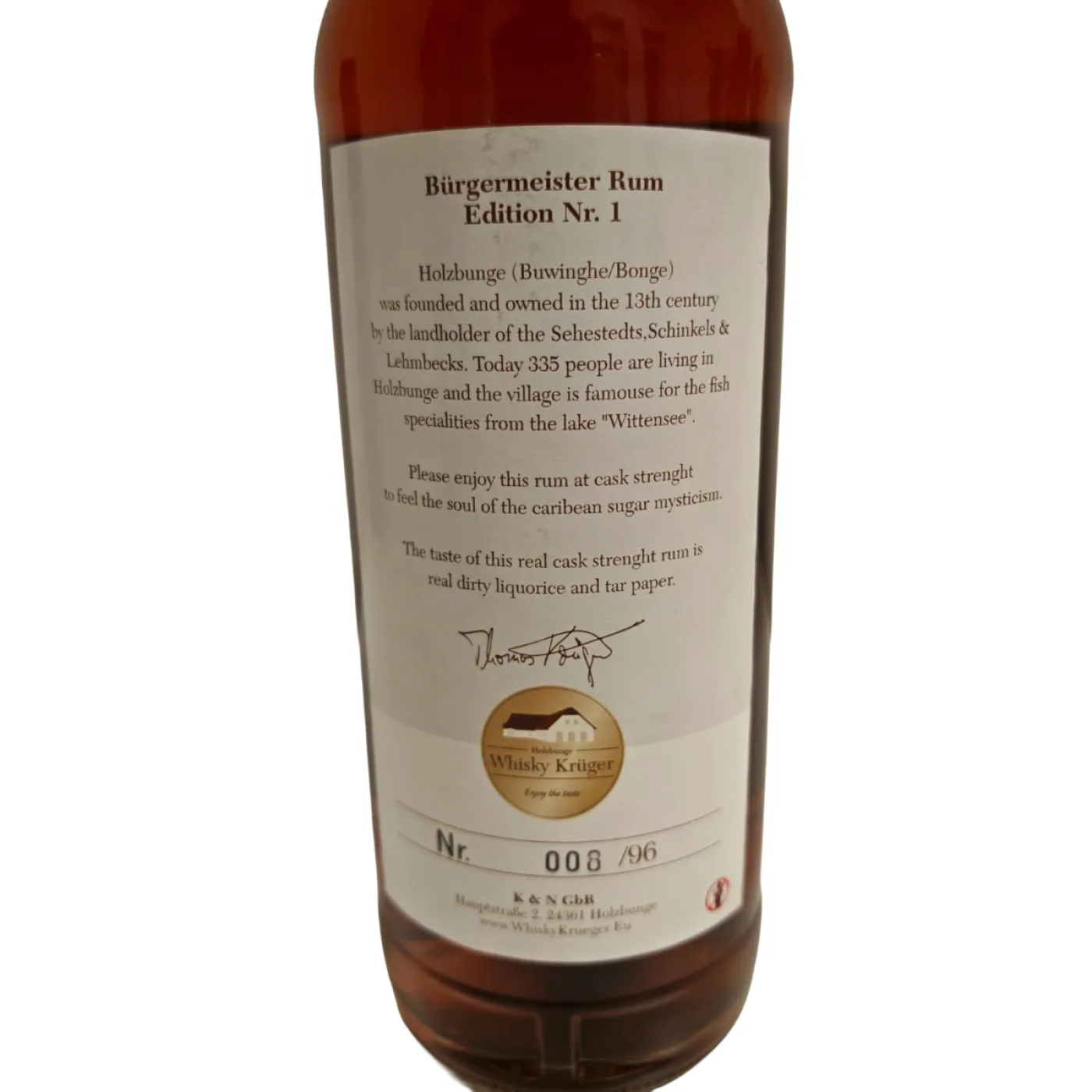 Abgefüllt von Whisky Krüger in Fassstärke (63,8 % Vol.) beeindruckt er mit komplexen Noten von Teer, Lack und Politur, die sich langsam zu einer überraschend fruchtigen Ebene öffnen. Holz, Würze und eine lang anhaltende, wärmende Kraft runden das Bild ab.
