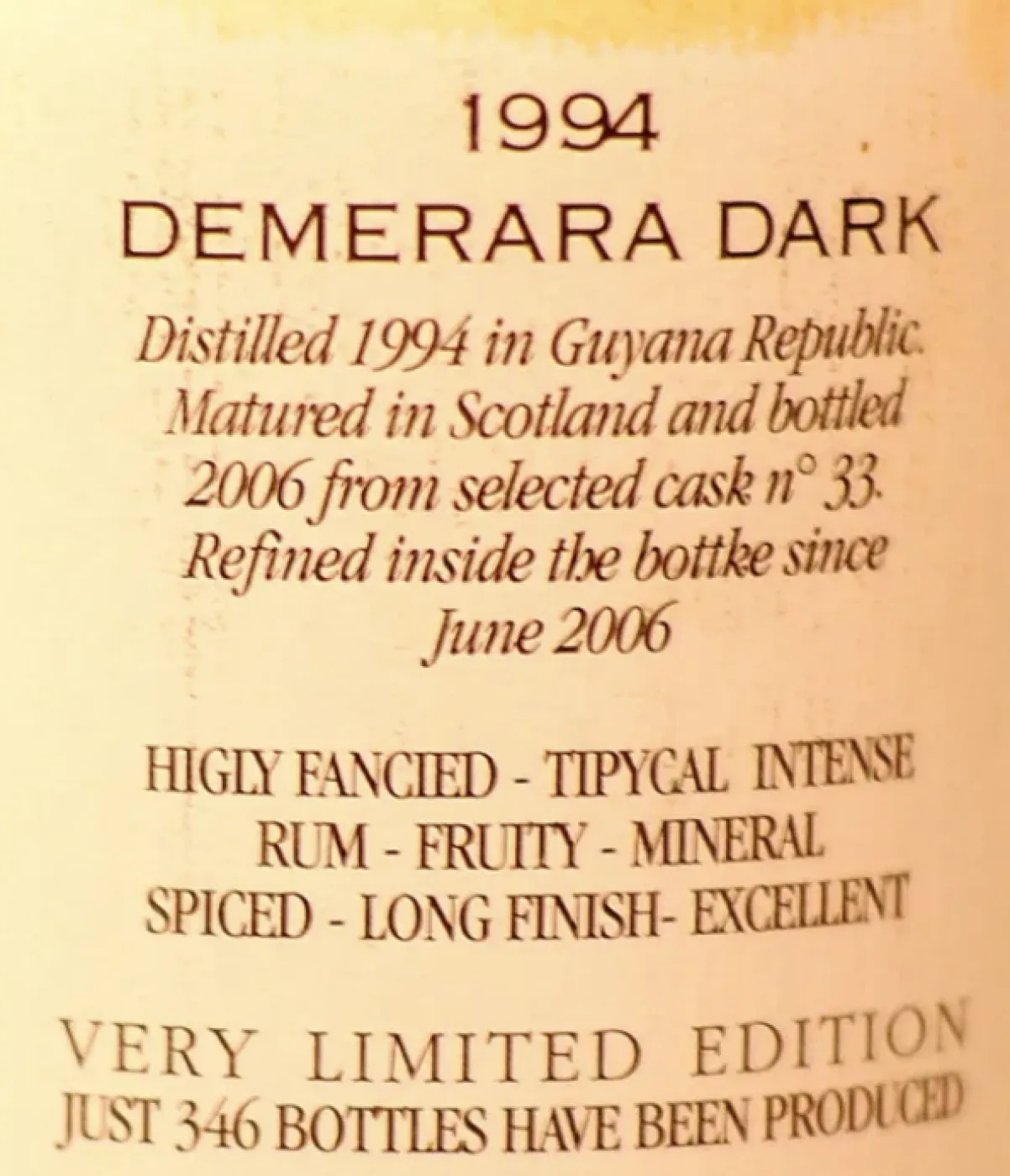 Ein traumhafter, eleganter Demerara Rum aus dem Jahr 1994, der bereits 2006 abgefülllt wurde. Nur 346 Flaschen exisitieren. Trotz der Verdünnung immer noch enorm kraftvoll und aromatisch. Obwohl nichts weiteres auf der Flasche angegeben wurde, gilt als gesichert, dass es sich hierbei um einen Enmore mit dem vielgesuchten und nur selten zu findenen Mark REV handelt.