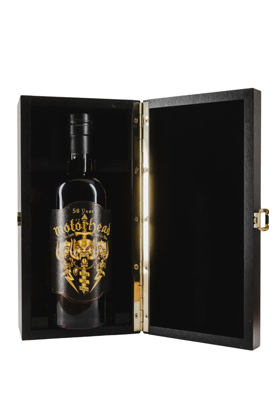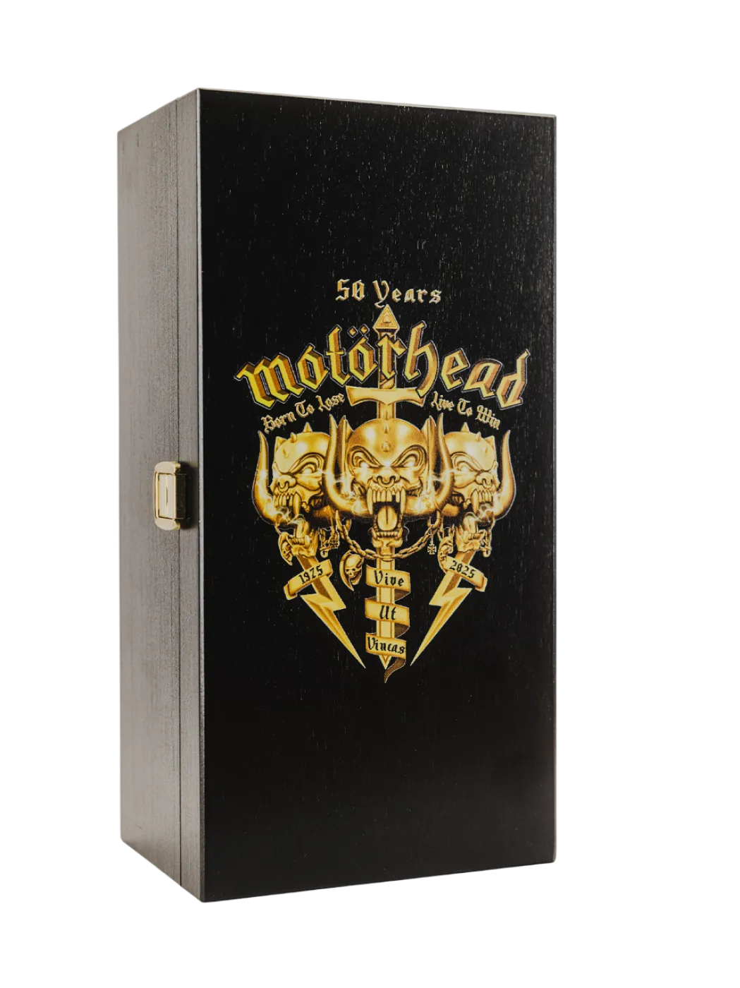 Zum Jubiläum erscheint ein einzigartiges Sammlerstück: ein 50 Jahre alter Single Grain Whisky, abgefüllt in streng limitierter Auflage von nur 150 Stück weltweit. Jede Flasche wird in einer aufwendig gestalteten Box präsentiert – ein Design, das die rohe Kraft von Motörhead mit edler Handwerkskunst verbindet.